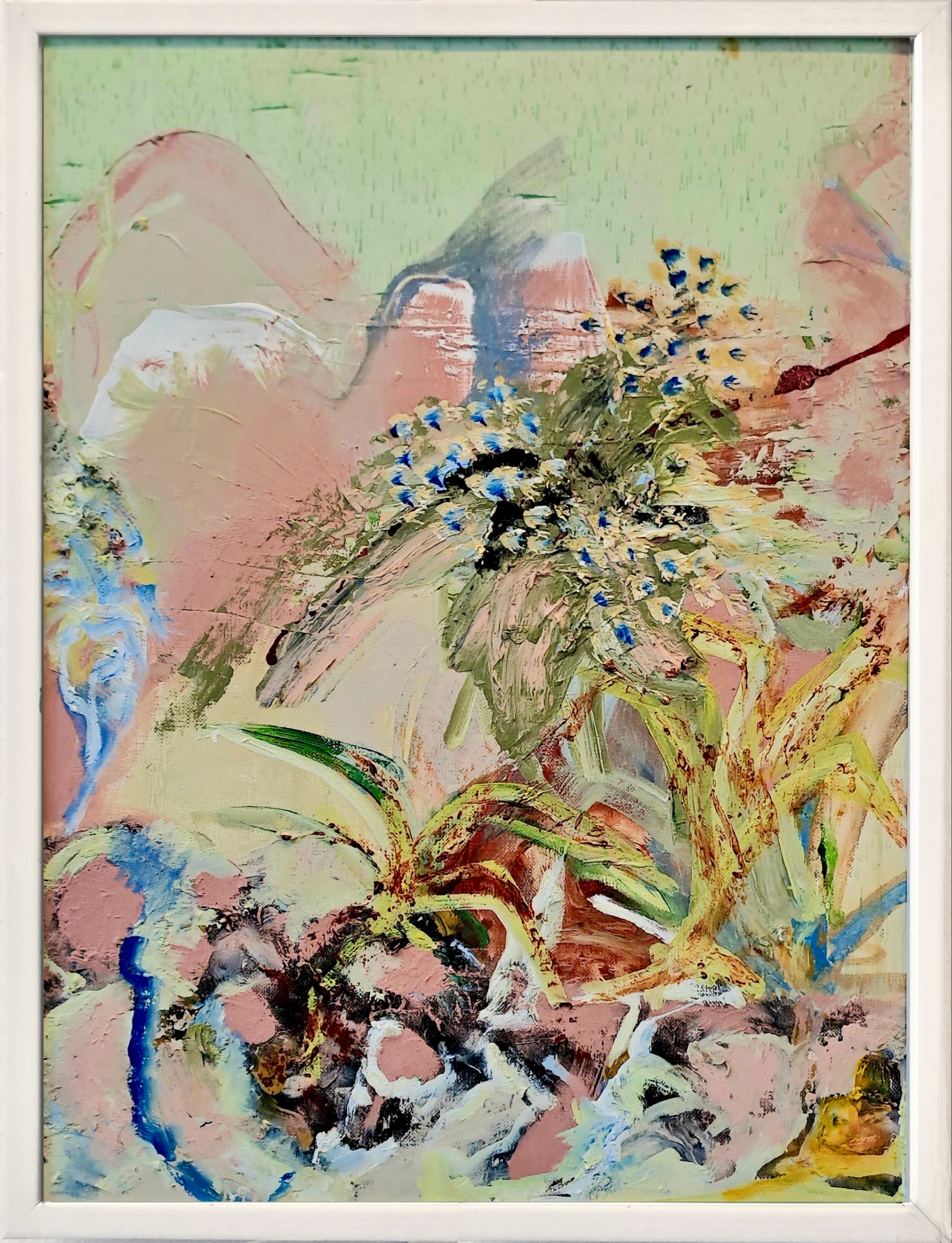 Mounted within a white wooden frame without glass.