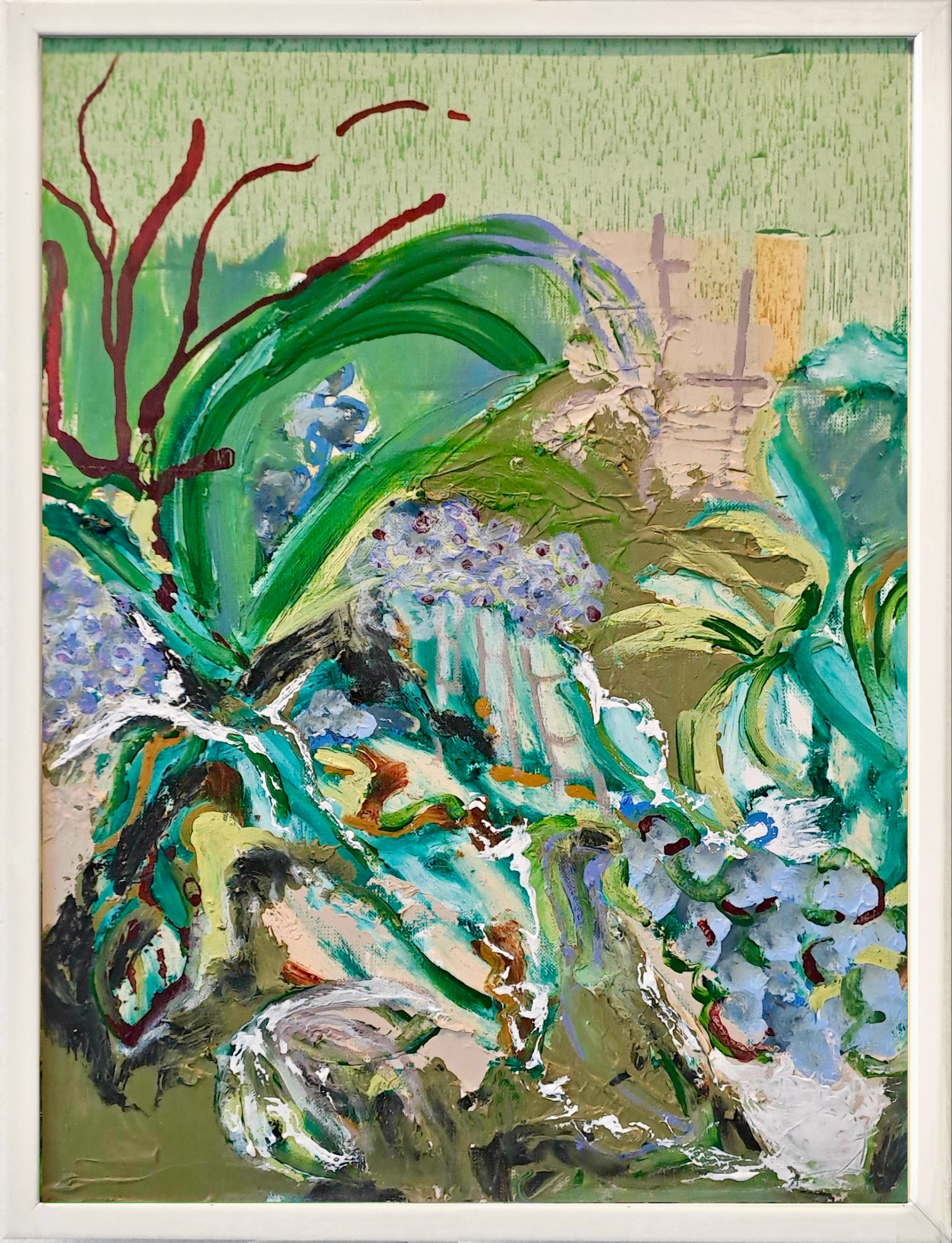 Mounted within a white wooden frame without glass.