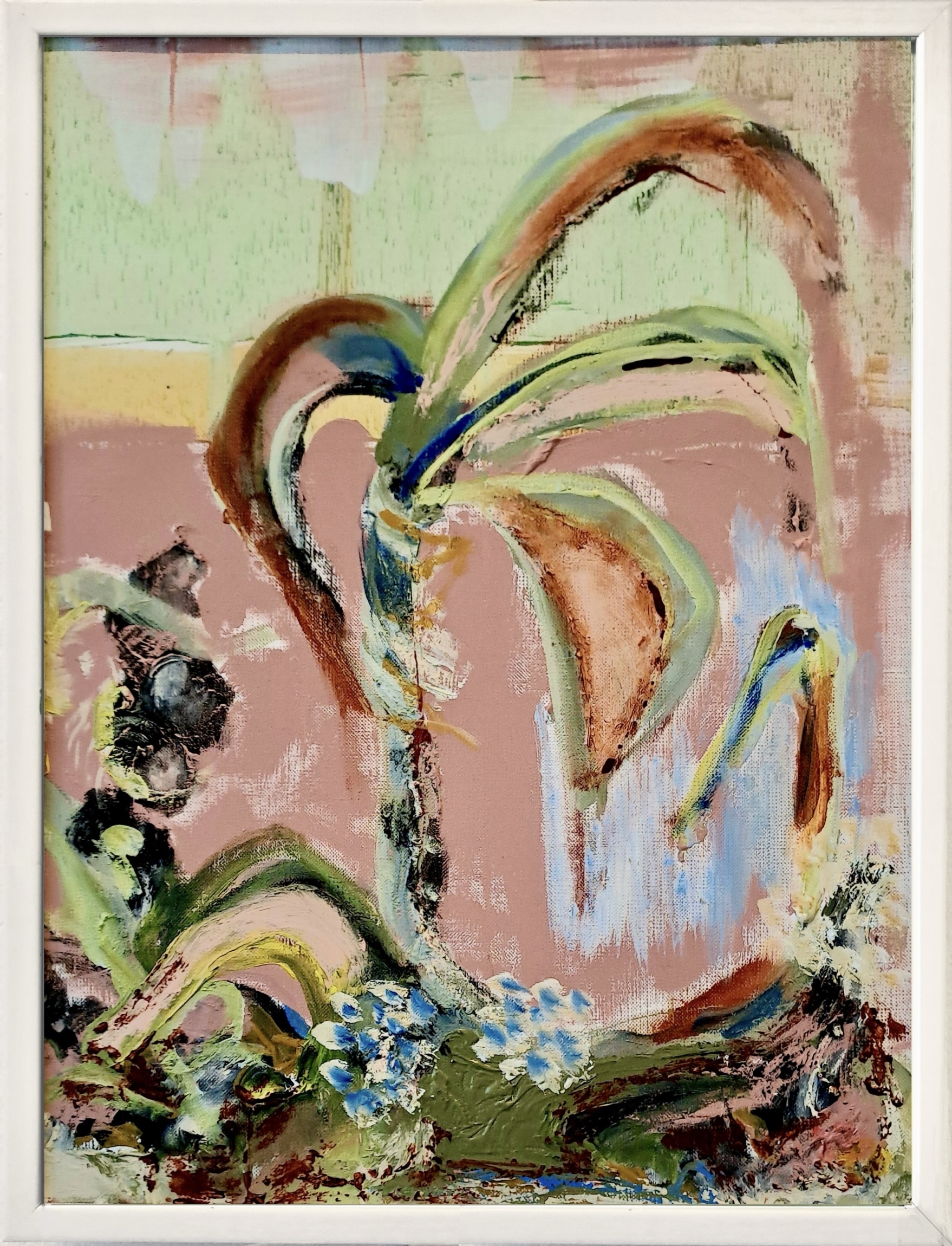 Mounted within a white wooden frame without glass.