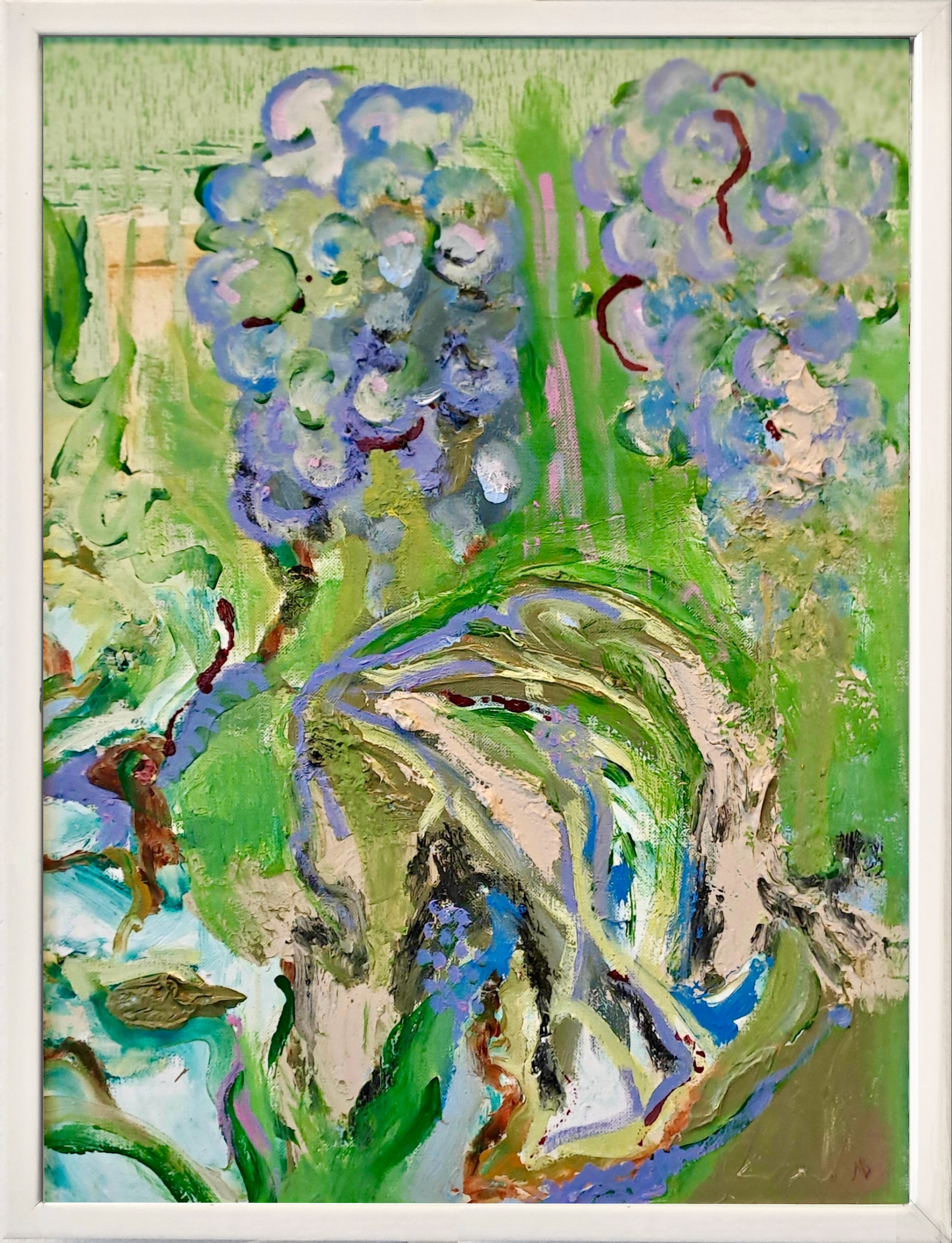 Mounted within a white wooden frame without glass.