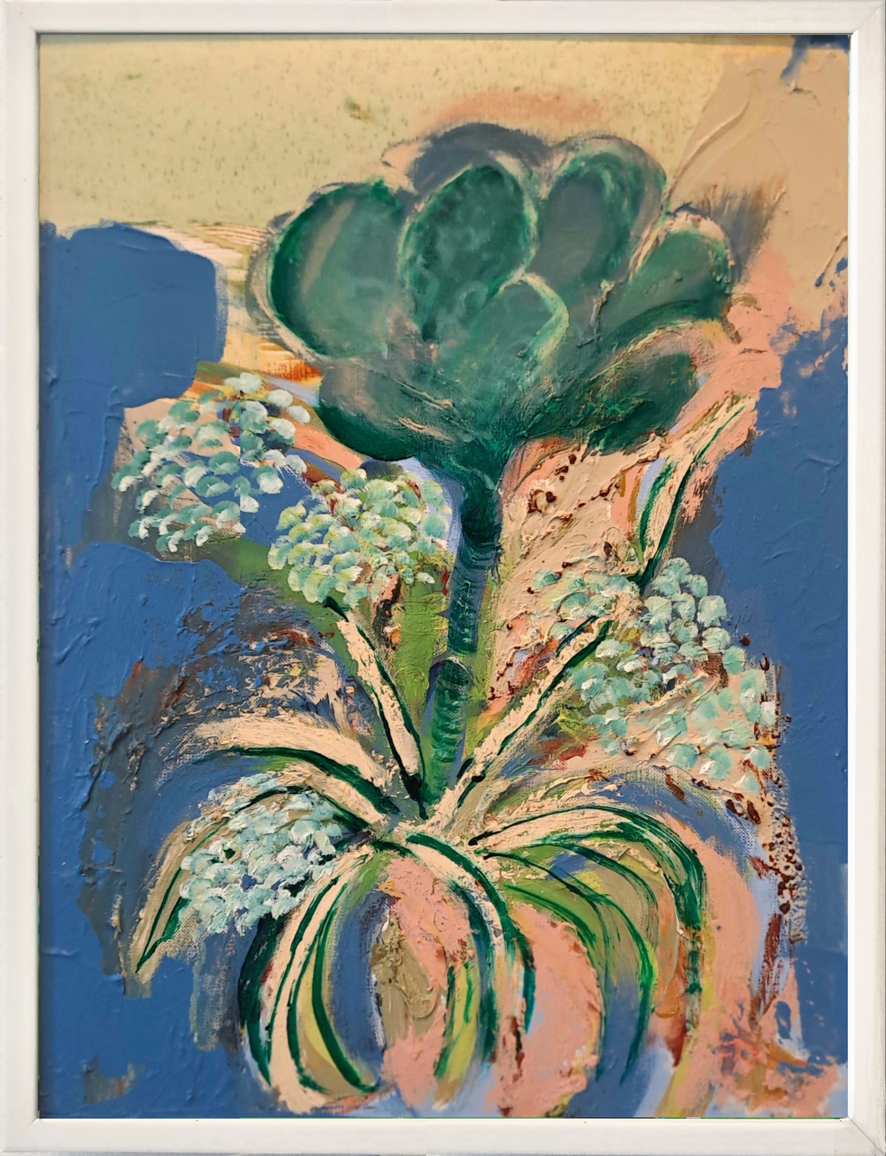 Mounted within a white wooden frame without glass.